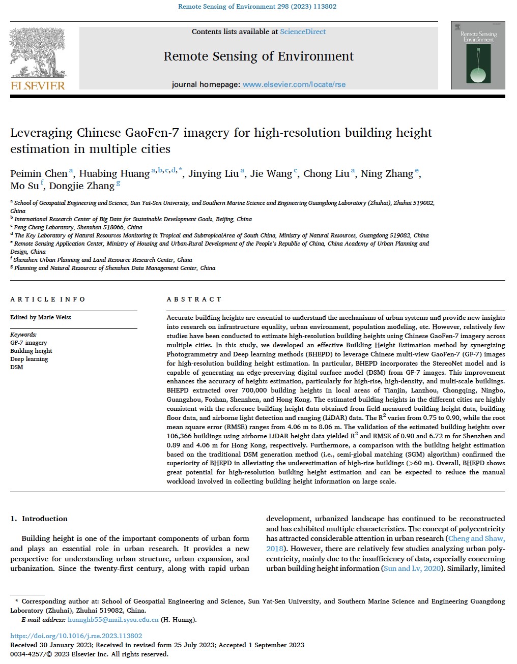 研究成果近日以“Leveraging Chinese GaoFen-7 imagery for high-resolution building height estimation in multiple cities”为题发表于遥感领域顶级期刊《Remote Sensing of Environment》。中山大学测绘科学与技术学院2022级博士研究生陈佩敏为论文的第一作者,黄华兵教授为论文的通讯作者,鹏城实验室王杰副研究员、住房和城乡建设部遥感应用中心张宁研究员、深圳市规划国土发展研究中心苏墨研究员、中山大学刘冲副研究员等为论文的合作作者。