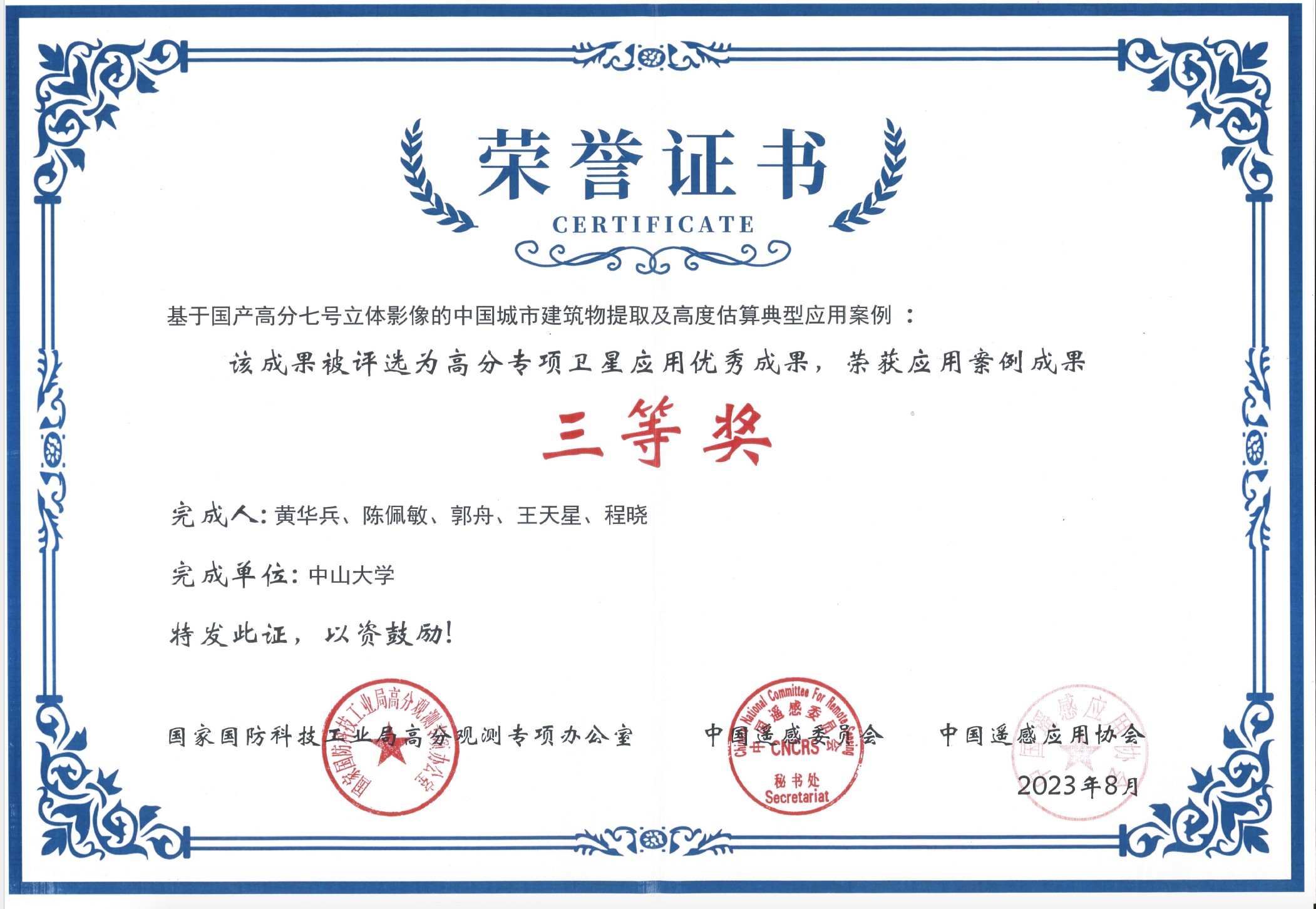 该研究得到了可持续发展大数据国际研究中心开放研究项目(CBAS2022ORP04)、国家自然科学基金(42371339,42371344)、广东省林业科技创新专项(2022KJCX004)的支持。同时,研究成果“基于国产高分七号立体影像的中国城市建筑物提取及高度估算典型应用案例”于近期入选《高分专项卫星应用优秀成果》三等奖。