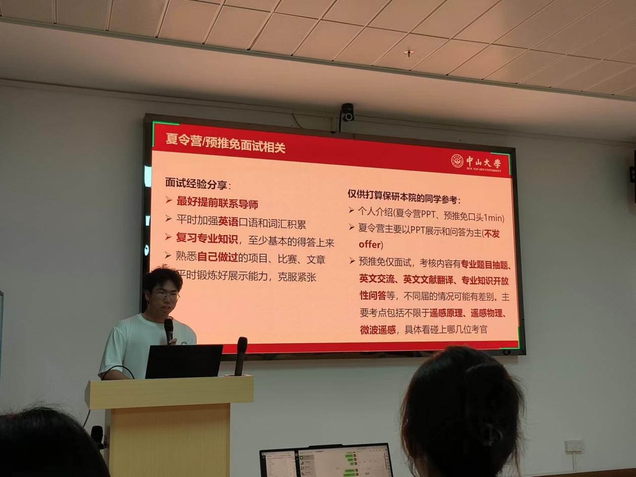 在这个春意盎然的季节里,中山大学测绘科学与技术学院再次迎来了一场意义非凡的学术盛会——“经验共享、筑梦前行”保研经验分享会。本次活动由学院学生会学术部主办,本科生第一党支部和本科生第二党支部协办,于2024年3月29日晚在测绘科学与技术学院大楼E320成功举行。