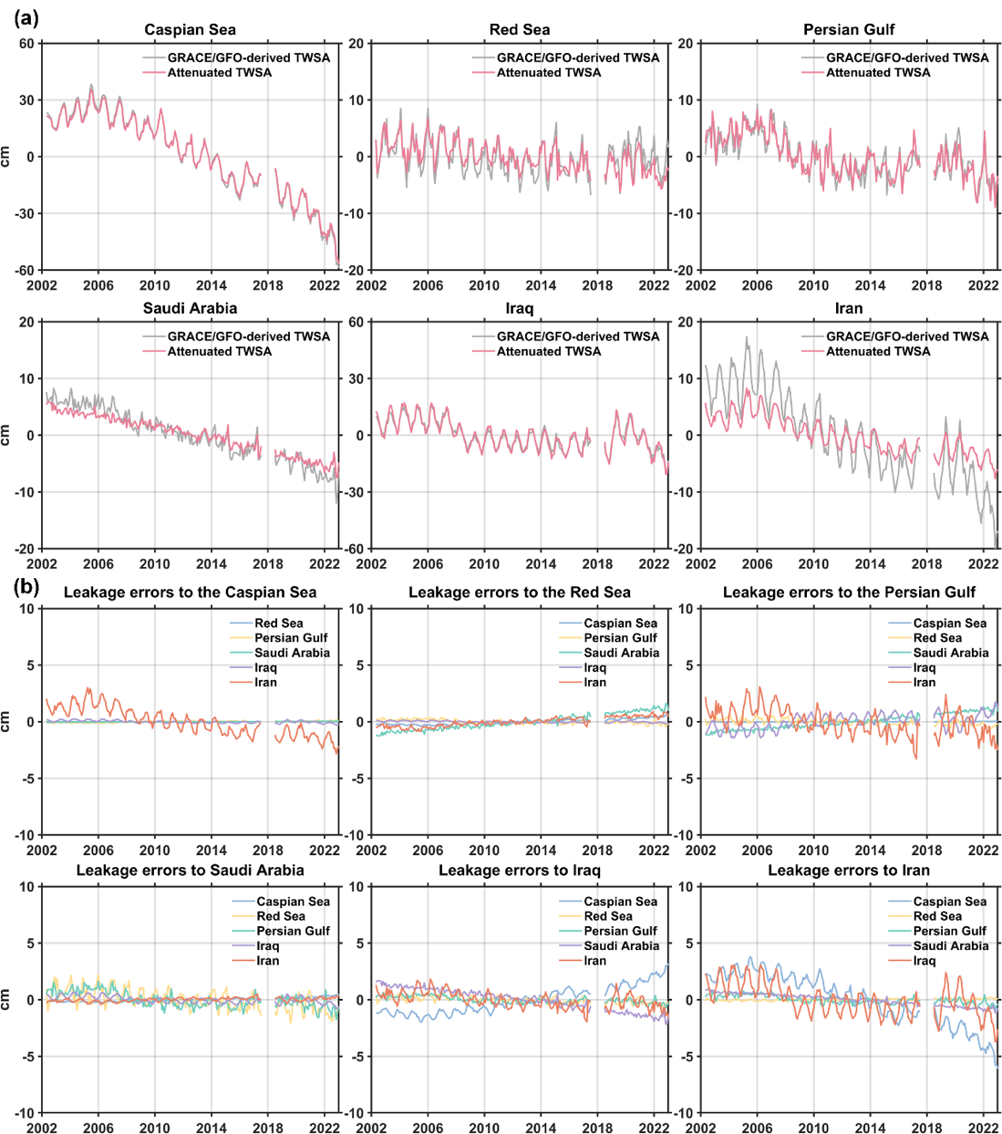 中东地区降水稀少、水资源管理效率较低,在气候变化和人类活动的综合影响下,部分地区地下水长期过度开采,区域水储量持续下降。尽管GRACE/GFO观测揭示了中东地区TWSA的下降趋势,但邻近区域如里海的长期地表水储量亏损,以及红海和波斯湾等海域的强季节性信号,通过信号泄漏和衰减严重干扰了目标区域TWSA的准确识别,导致了卫星重力信号恢复的复杂性。