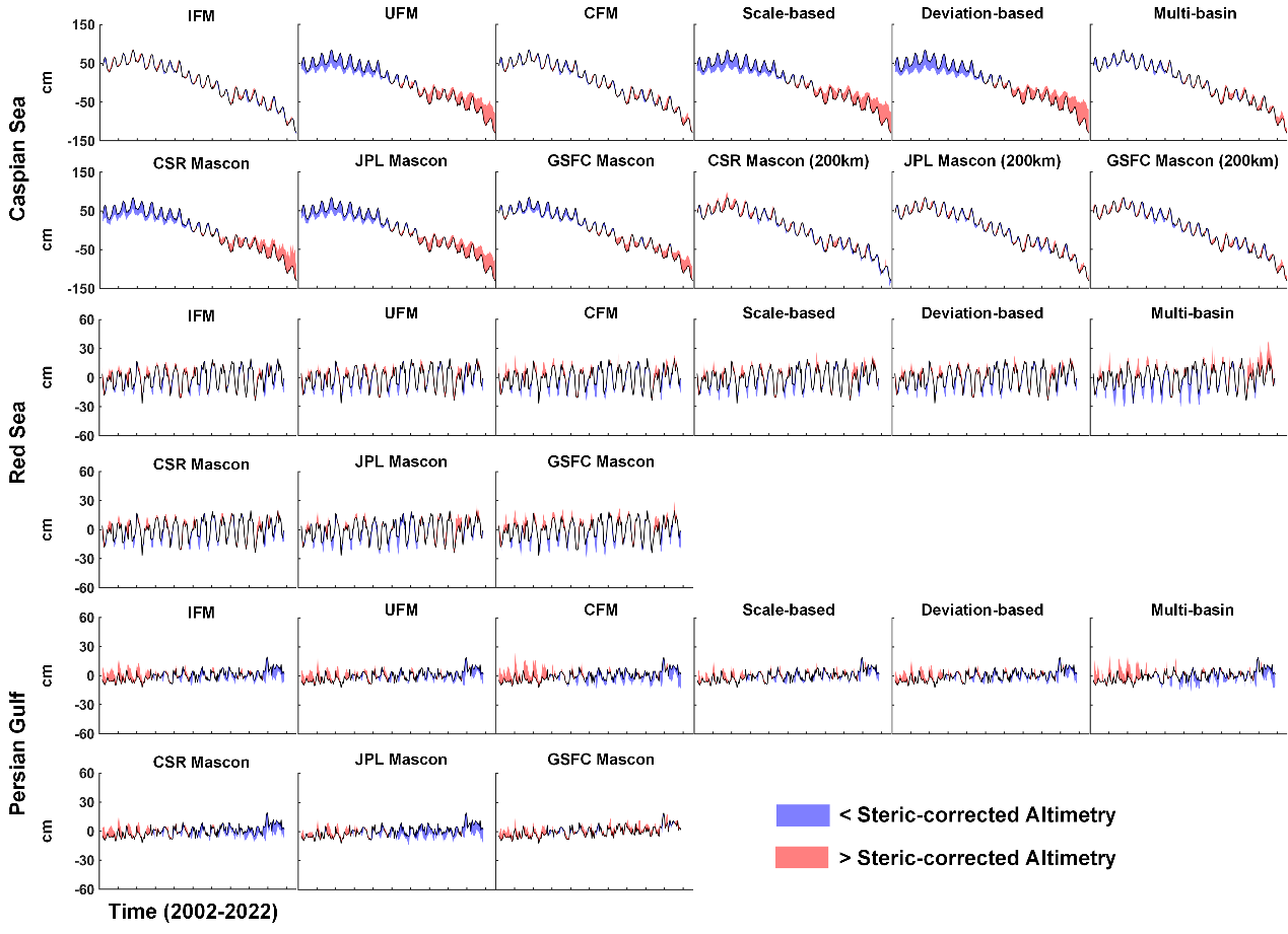 本项研究进一步利用比容改正后的测高结果,在里海对IFM信号恢复结果开展了独立精度验证(图3)。IFM恢复的水储量变化显示出明显的季节波动和显著下降趋势,亏损速率为8.0±0.3 cm/yr(29.58±1.14 km3/yr),与比容改正后的测高估算结果高度一致,优于mascon产品和其他信号恢复方法。在红海和波斯湾等其他海域,IFM恢复结果同样与比容改正后的测高估算结果更为一致,而mascon产品未能有效减少这些区域的泄漏误差。