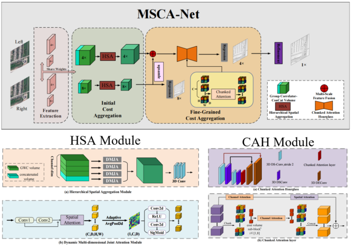 本研究以代价空间冗余为切入点,重点针对代价聚合环节设计了基于代价体正则化约束的多尺度分块注意力网络(MSCA-Net)。网络首先利用金字塔特征构建多尺度代价体,在代价聚合阶段,通过所设计的分级空间聚合模块(HSA)动态捕获代价体不同层级的信息,实现对重复纹理精细结构与弱纹理区域全局语义的准确感知,完成初步正则化。之后,基于设计的分块注意力沙漏模块(CAH)通过对代价体的多维切割,对子代价体独立正则化,准确捕捉视差不连续区域局部细节,抑制冗余信息干扰,基于上述流程的协同作用有效提升一众难处理区域的匹配精度。