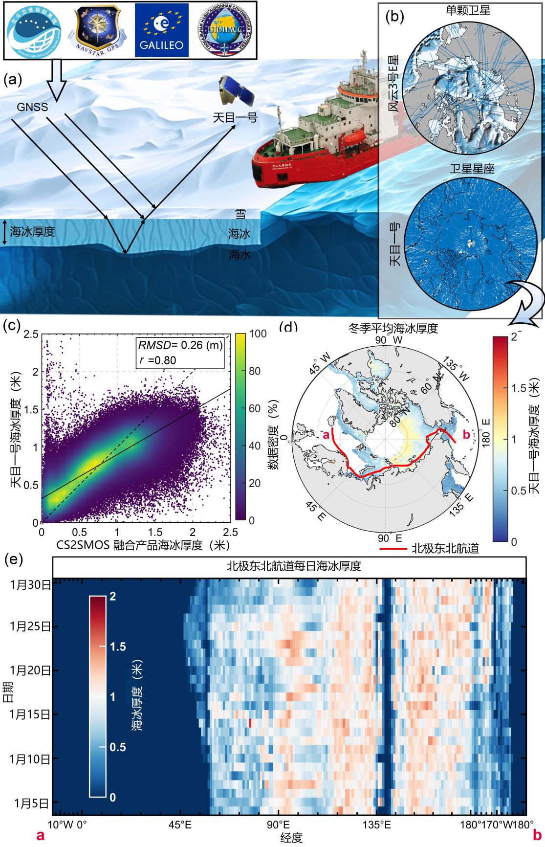 图片摘要:(a)GNSS-R监测海冰厚度示意图;(b)风云3号E单颗卫星与天目一号卫星星座单日覆盖率示意图;(c)天目一号监测的海冰厚度与 CS2SMOS融合产品(CryoSat-2 和 SMOS)精度对比;(d)天目一号监测的北极冬季平均海冰厚度,图中红线(ab)为北极东北航道;(d)2024年1月5号到30号北极东北航道每日海冰厚度图。