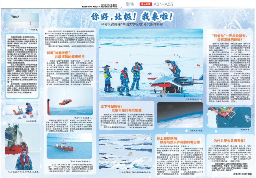 这是中山大学遥感科学与技术学院博士生李博写给《珠海少年》周刊小读者的一段话。2025年12月,他的科普文章《你好,北极!我来啦!科考队员揭秘“中山大学极地”号北冰洋科考》刊发,用第一视角带孩子们“穿越”到北纬80度以上的冰原,认识会飞的“天空之眼”、会潜水的“海底侦探”,也讲述了在暴风雪中手拉安全绳返回船舱的惊险一刻。