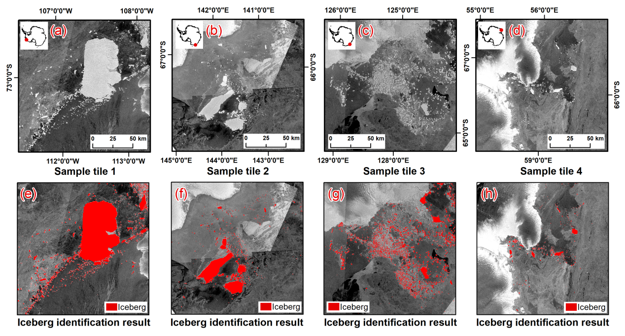 一是挪威基于船舶观测数据的SCAR国际冰山数据库,但观测范围受航行路线限制,难以系统覆盖整个南大洋;二是美国基于低空间分辨率的微波辐射计和雷达散射计数据的BYU/NIC冰山轨迹数据库,仅包含长轴大于5公里的冰山;三是法国基于雷达高度计的Altiberg数据库,虽然覆盖范围广,但无法分辨海冰密集区的冰山信号;四是基于高分辨率SAR数据的环南极冰山分布数据产品,但仅获取南极沿岸冰山数据。