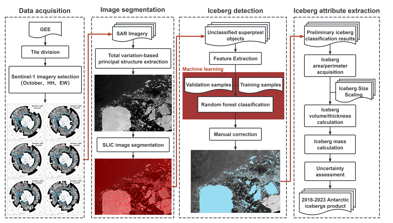 文章的通讯作者李腾副教授详细阐述了这次南极冰山“建档”的技术路线:“我们基于Google Earth Engine平台获取Sentinel-1 SAR镶嵌影像,覆盖南纬55°以南的南大洋海域。研究采用增量随机森林分类与人工校正相结合的半自动方法,提取了面积大于0.04平方公里的冰山,构建了2018-2023年每年10月的冰山分布数据集。”