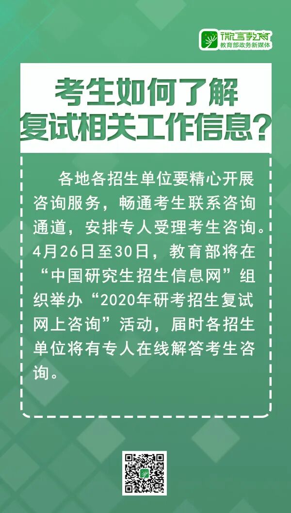 2.为方便考生及时、准确了解各招生单位复试办法和要求,4月26日至30日,中国研究生招生信息网(公网网址:http://yz.chsi.com.cn,教育网网址:http://yz.chsi.cn)将组织举办“2020年研考招生复试网上咨询”活动,届时相关招生单位将在线解答考生咨询。