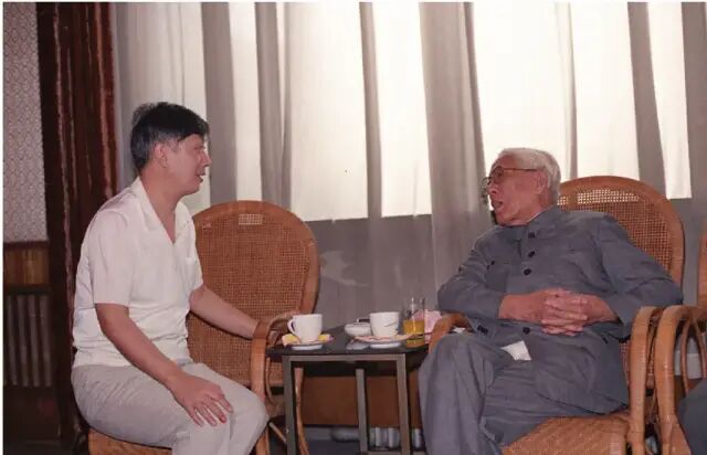 1988年,陈俊勇先生与中国科学院院士、著名流体力学家、理论物理学家周培源(右)交流