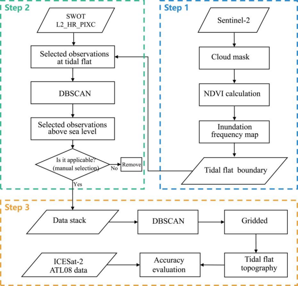 The launch of the Surface Water and Ocean Topography (SWOT) mission presented a new opportunity. Although primarily designed for observing oceans and inland waters, SWOT's interferometric synthetic aperture radar (InSAR) capabilities offer the potential for direct topographic measurement. Previous studies utilizing SWOT for intertidal mapping still depended on external tidal models or tide gauge records. This study was therefore motivated to develop a novel, self-contained method that leverages SWOT's unique ability to simultaneously observe sea surface height and tidal flat elevation. The goal was to create a robust, satellite-data-only workflow for generating high-resolution (10-meter) intertidal digital elevation models (DEMs) without any dependency on ground-based observations, thereby enhancing the capability for widespread and repeatable coastal monitoring.