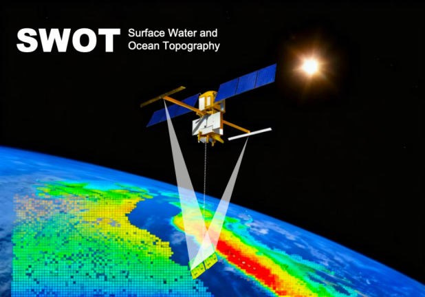 图1. 宽刈幅高度计SWOT合成孔径雷达干涉测量原理示意图(改自NASA)。