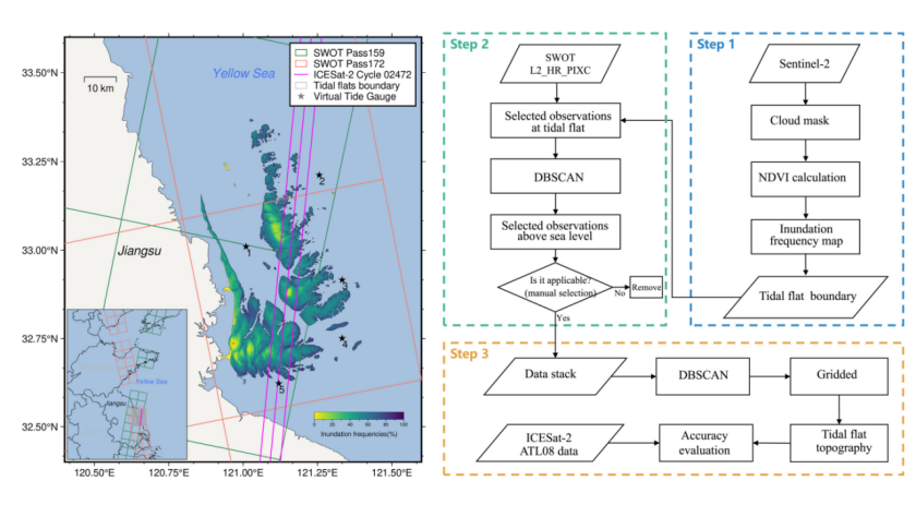 本研究聚焦中国江苏省沿海的典型潮间带——苏北浅滩,该区域发育有全球规模最大的辐射状海底沙脊体系,潮滩南北纵向延伸约200公里,东西跨度约90公里,总面积逾1,018平方公里。基于SWOT卫星像素云数据(L2_HR_PIXC产品)与Sentinel-2遥感影像,本研究实现了不依赖任何地面实测或模型辅助的潮滩高精度制图。数据处理流程(图2)主要包括以下关键步骤: