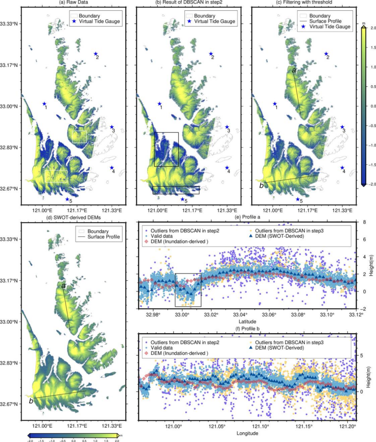 图3. (a–c) 以第3周期第159条轨道数据为例,展示基于DBSCAN与虚拟潮位站阈值筛选的数据处理流程(对应图2步骤2)。(d) 本研究生成的模型,e和f分别为沿a和b剖面线的像素云异常值筛选过程。