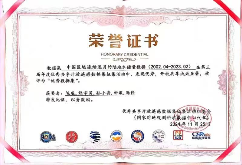 近日,由国家对地观测科学数据中心、遥感学报等8家单位联合主办的“第四届优秀共享开放遥感数据集征集活动”评选结果正式揭晓。经过层层审核与评估,课题组发布的“基于卫星重力的中国区域陆地水和地下水储量变化产品(2002-2022)”与“中国大陆区域降水驱动的陆地水储量距平数据集(2002-2022)”获评“优秀数据集”。